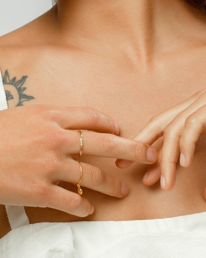 แหวนคิวบิกเซอร์โคเนียสีสันสดใสวงนี้ ได้รับแรงบันดาลใจจากความมหัศจรรย์ของสายรุ้ง เป็นตัวแทนของความสุข ความหลากหลาย และความหวัง เป็นเครื่องเตือนใจว่าหลังพายุฝนฟ้าคะนองยังคงมีแสงสว่างเสมอ