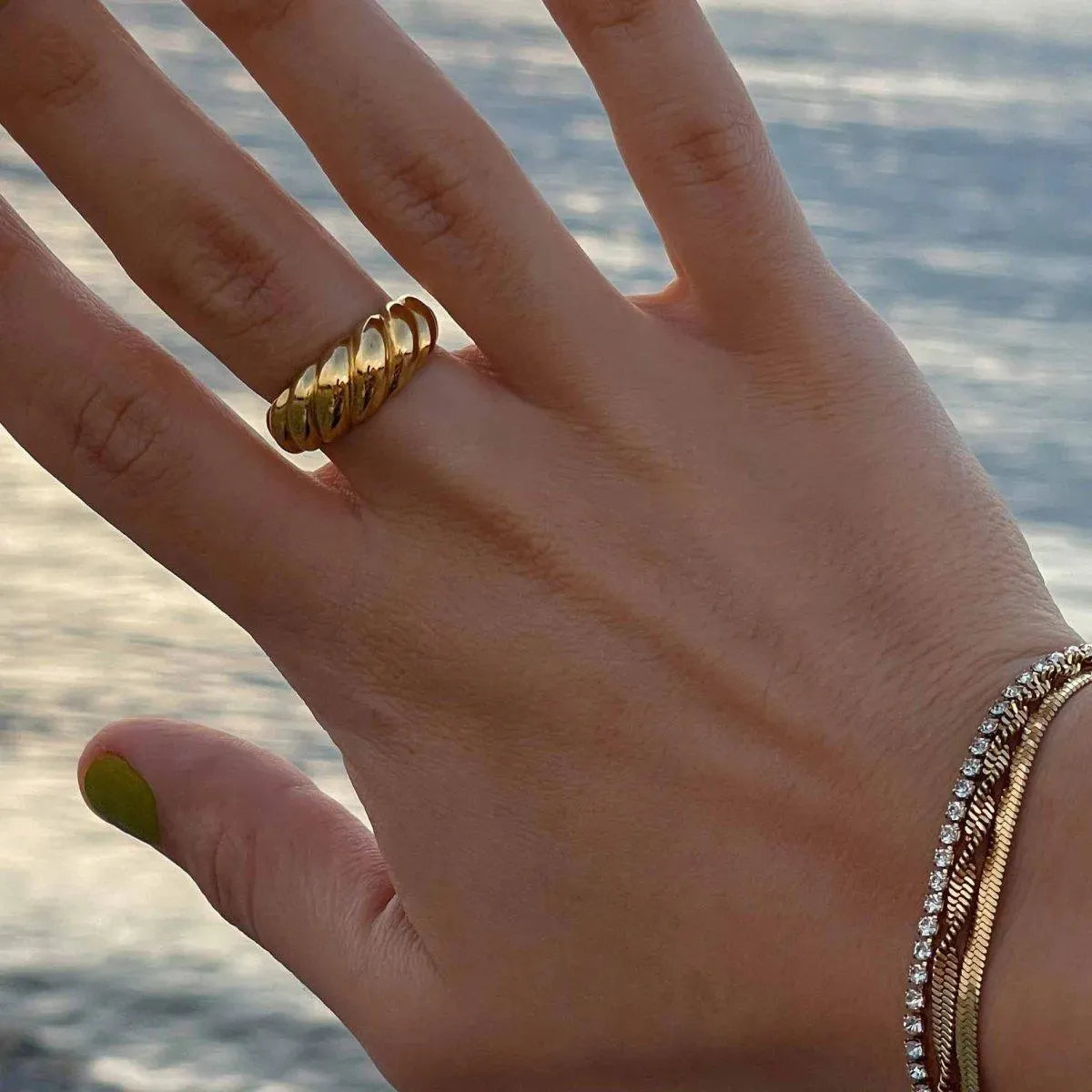 เราหลงใหลแหวน Paris ของเรามาก ! นี่คือแหวนที่สมบูรณ์แบบสำหรับสัมผัสแห่งความสง่างามที่คุณมองหา เราผสมผสานพื้นผิวที่แข็งแรงเข้ากับพื้นผิวที่บอบบาง! ดูเหมือนครัวซองต์ แต่อย่าพยายามกินมัน 🥐 ...! คุณจะพลาดไหม?