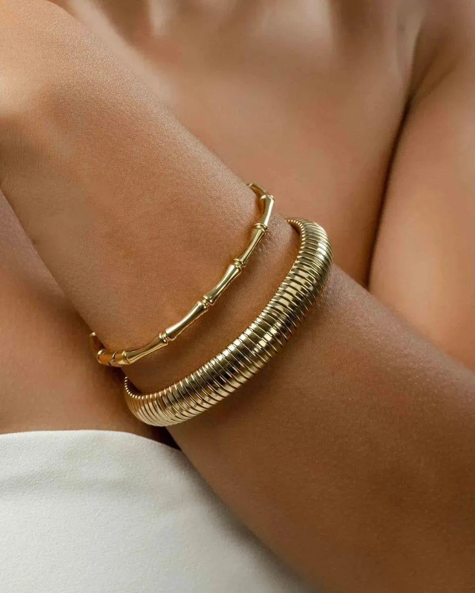 กำไลข้อมือนี้ได้รับแรงบันดาลใจจากพื้นผิวธรรมชาติของไม้ไผ่ สะท้อนถึงการผสมผสานที่ลงตัวระหว่างความแข็งแกร่งและความงามตามธรรมชาติ